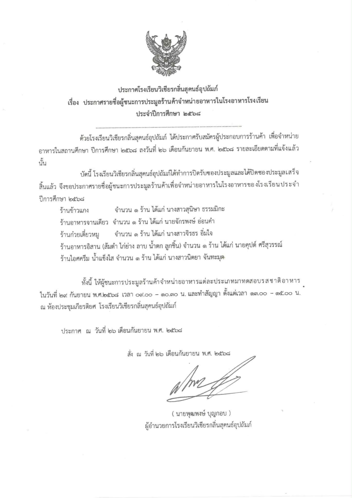 ประกาศรายชื่อผู้ชนะการประมูลร้านค้าจำหน่ายอาหารในโรงอาหารโรงเรียน ประจำปี 2568
